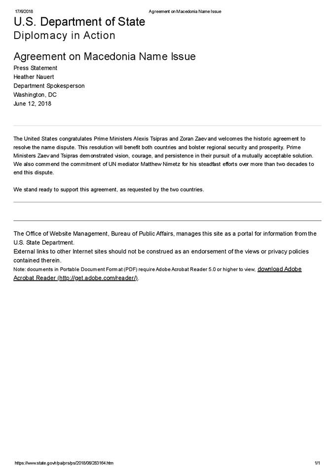 Τέλος το αμερικανικό υπουργείο Εξωτερικών χαιρετίζει τις προσπάθειες, που κατέβαλε για την επίλυση της διαφοράς για περισσότερες από δύο δεκαετίες ο ειδικός διαμεσολαβητής του ΟΗΕ, Matthew Nimetz.