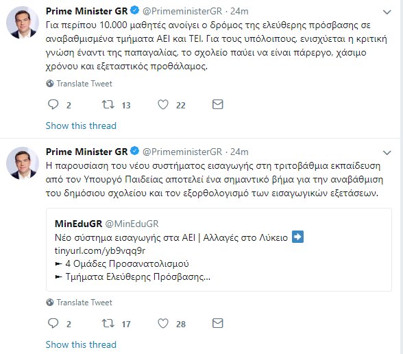 «Η παρουσίαση του νέου συστήματος εισαγωγής στη τριτοβάθμια εκπαίδευση από τον υπουργό Παιδείας αποτελεί ένα σημαντικό βήμα για την αναβάθμιση του δημόσιου σχολείου και τον εξορθολογισμό των εισαγωγικών εξετάσεων», ανέφερε ο πρωθυπουργός με ανάρτησή του στο «twitter».