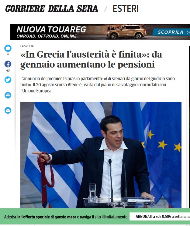 Στην νέα οικονομική περίοδο της Ελλάδας, μετά την λήξη των μνημονίων, αναφέρεται σε άρθρο της με τίτλο «Η Ελλάδα αφήνει πίσω της την λιτότητα, από τον Ιανουάριο αυξάνονται οι συντάξεις», η ιταλική εφημερίδα Corriere della Sera.