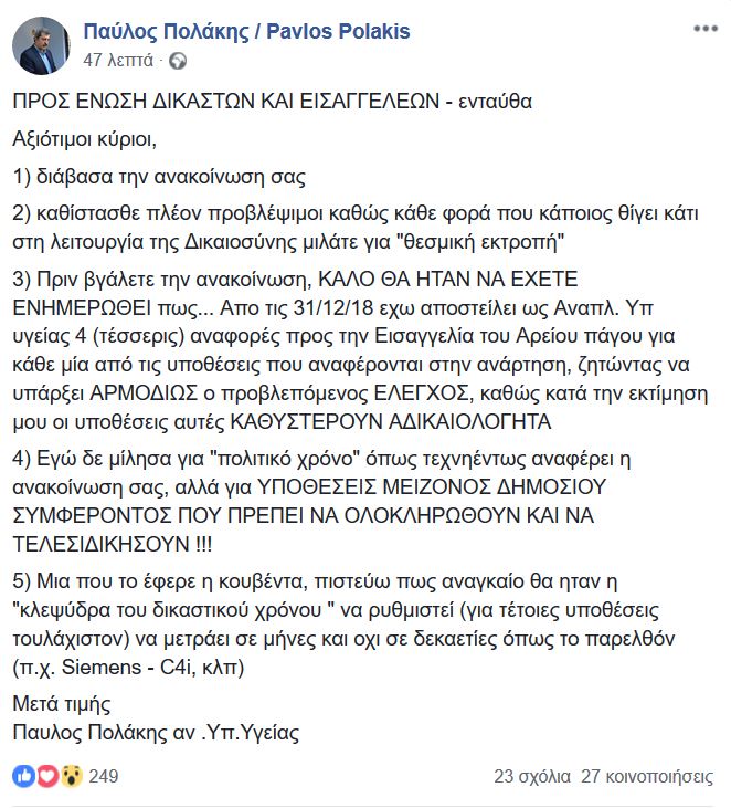 Παράλληλα, αναφέρει ότι «οι δημόσιες αναρτήσεις του υπουργού κ. Πολάκη, οι οποίες ευελπιστούμε να απηχούν μόνο προσωπικές του απόψεις και όχι της κυβέρνησης στην οποία συμμετέχει, διά των οποίων ψέγει, και μάλιστα ονομαστικά, εισαγγελικούς και δικαστικούς λειτουργούς επειδή οι χειρισμοί τους σε εκκρεμείς υποθέσεις πολιτικού ενδιαφέροντος δεν είναι της αρεσκείας του, προδικάζοντας και υποδεικνύοντας την επιθυμητή έκβασή τους, υποσκάπτουν το δικαιϊκό οικοδόμημα της χώρας και διακυβεύουν την ομαλή λειτουργία του πολιτεύματος».