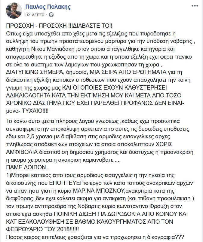 Στην ανάρτηση του στο Facebook ο κ.Πολάκης θέτει μια σειρά ερωτημάτων για την υπόθεση του ΚΕΕΛΠΝΟ, βάζοντας στο στόχαστρο του οικονομικούς εισαγγελείς και ανακριτές που σχετίζονται με την υπόθεση του ΚΕΕΛΠΝΟ αλλά και την προανάκριση εις βάρος του διοικητής της ΤτΕ, Γιάννη Στουρνάρα.