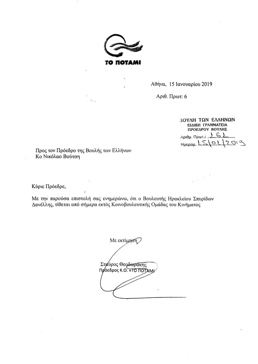 Νωρίτερα άλλωστε ο ο εκπρόσωπος τύπου του Ποταμιού, Δ. Τσιόδρας, είχε δηλώσει ότι ο Σπύρος Δανέλλης δεν βρίσκεται πλέον στην Κοινοβουλευτική Ομάδα του Ποταμιού.