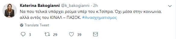 Όχι μέσα στην κοινωνία, αλλά εντός του ΚΙΝΑΛ - ΠΑΣΟΚ», ανέφερε με ανάρτησή της στο «Twitter» η κ. Μπακογιάννη, με αφορμή την ανακοίνωση του ανασχηματισμού της κυβέρνησης.