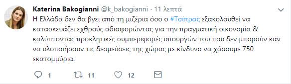 Με ένα αιχμηρό tweet σχολίασε η εκπρόσωπος του Ποταμιού, Κατερίνα Μπακογιάννη, τη σημερινή (20/2/2019) ομιλία του πρωθυπουργού, Αλέξη Τσίπρα, στο υπουργικό συμβούλιο.