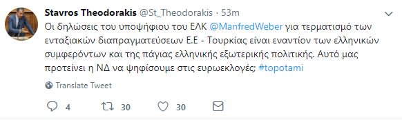 «Οι δηλώσεις του υποψήφιου του ΕΛΚ Manfred Weber για τερματισμό των ενταξιακών διαπραγματεύσεων Ε.Ε - Τουρκίας είναι εναντίον των ελληνικών συμφερόντων και της πάγιας ελληνικής εξωτερικής πολιτικής.
