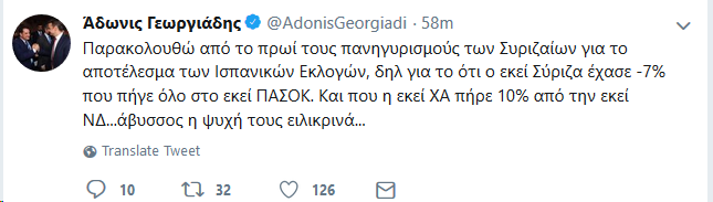 «Παρακολουθώ από το πρωί τους πανηγυρισμούς των Συριζαίων για το αποτέλεσμα των Ισπανικών Εκλογών, δηλ για το ότι ο εκεί Σύριζα έχασε -7% που πήγε όλο στο εκεί ΠΑΣΟΚ.