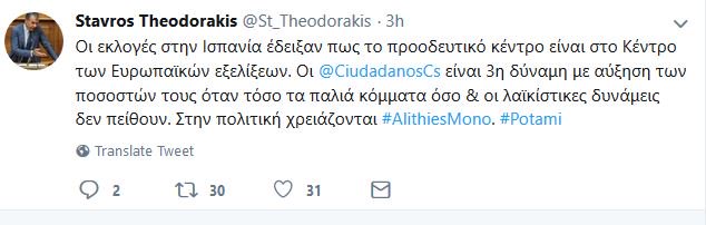 Στην πολιτική χρειάζονται #AlithiesMono», έγραψε ο Σταύρος Θεοδωράκης στο twitter.