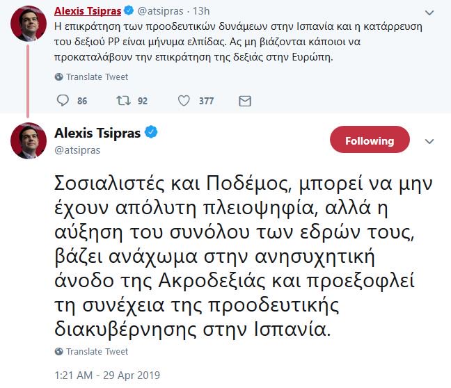 Σε άλλο tweet ο πρωθυπουργός επισημαίνει ότι τα ποσοστά των Σοσιαλιστών και του Podemos βάζουν ανάχωμα στην ανησυχητική άνοδο της Ακροδεξιάς και προεξοφλεί τη συνέχεια της προοδευτικής διακυβέρνησης στην Ισπανία.