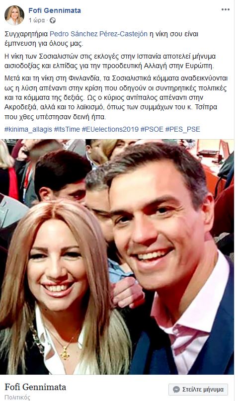 Η νίκη των Σοσιαλιστών στις εκλογές στην Ισπανία αποτελεί μήνυμα αισιοδοξίας και ελπίδας για την προοδευτική Αλλαγή στην Ευρώπη», έγραψε στο Facebook η πρόεδρος του Κινήματος Αλλαγής, Φώφη Γεννηματά.