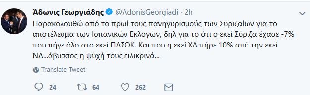 «Παρακολουθώ από το πρωί τους πανηγυρισμούς των Συριζαίων για το αποτέλεσμα των Ισπανικών Εκλογών, δηλ για το ότι ο εκεί Σύριζα έχασε -7% που πήγε όλο στο εκεί ΠΑΣΟΚ. Και που η εκεί ΧΑ πήρε 10% από την εκεί ΝΔ ...άβυσσος η ψυχή τους ειλικρινά...» γράφει συγκεκριμένα ο κ. Γεωργιάδης.