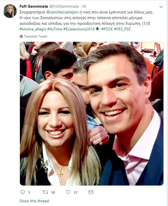 Η νίκη των Σοσιαλιστών στις εκλογές στην Ισπανία αποτελεί μήνυμα αισιοδοξίας και ελπίδας για την προοδευτική Αλλαγή στην Ευρώπη», ανέφερε με ανάρτησή της στο «Twitter» η κ. Γεννηματά.