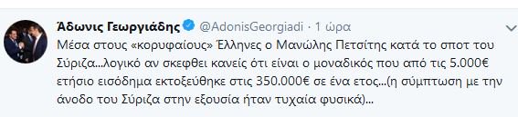 Όπως έγραψε στο Twitter ο κ. Γεωργιάδης, ο Μανώλης Πετσίτης είναι ο μοναδικός Έλληνας του οποίου το ετήσιο εισόδημα εκτοξεύθηκε από τις 5.000 στις 350.000 ευρώ με την άνοδο του ΣΥΡΙΖΑ στην εξουσία.