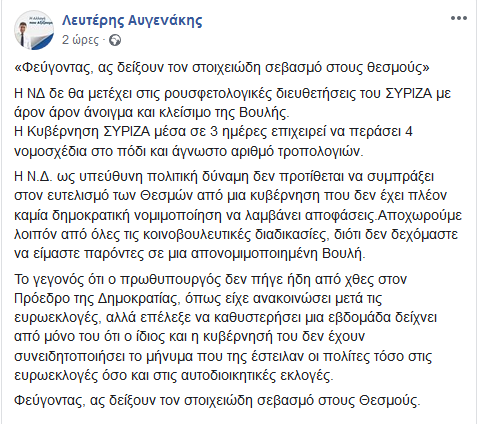 «Η κυβέρνηση ΣΥΡΙΖΑ, μέσα σε 3 ημέρες, επιχειρεί να περάσει 4 νομοσχέδια στο πόδι και άγνωστο αριθμό τροπολογιών. Η ΝΔ ως υπεύθυνη πολιτική δύναμη δεν προτίθεται να συμπράξει στον ευτελισμό των Θεσμών από μια κυβέρνηση που δεν έχει πλέον καμία δημοκρατική νομιμοποίηση να λαμβάνει αποφάσεις. Αποχωρούμε λοιπόν από όλες τις κοινοβουλευτικές διαδικασίες, διότι δεν δεχόμαστε να είμαστε παρόντες σε μια απονομιμοποιημένη Βουλή», σημειώνει ο κ. Αυγενάκης και προσθέτει: « Η ΝΔ δε θα μετέχει στις ρουσφετολογικές διευθετήσεις του ΣΥΡΙΖΑ με άρον άρον άνοιγμα και κλείσιμο της Βουλής.