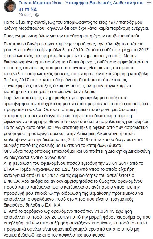 Για το θέμα της συντάξεως του αποβιώσαντος το έτος 1977 πατρός μου Ιωάννη Μορόπουλου, δηλώνω ότι δεν έχω κάνει καμία παράνομη ενέργεια.