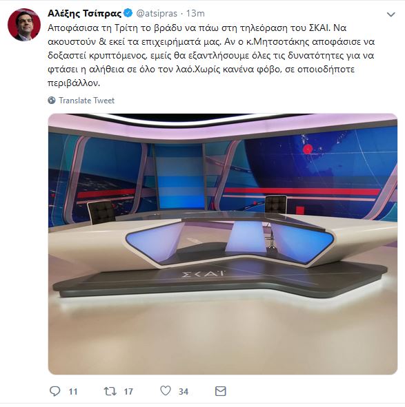 «Αποφάσισα την Τρίτη το βράδυ να πάω στη τηλεόραση του ΣΚΑΙ. Να ακουστούν και εκεί τα επιχειρήματά μας.
