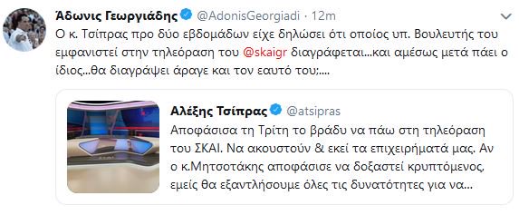 «Ο κ. Τσίπρας προ δύο εβδομάδων είχε δηλώσει ότι οποίος υπ. Βουλευτής του εμφανιστεί στην τηλεόραση του ΣΚΑΙ διαγράφεται...και αμέσως μετά πάει ο ίδιος...θα διαγράψει άραγε και τον εαυτό του;....», έγραψε στο Twitter ο Άδωνις Γεωργιάδης.