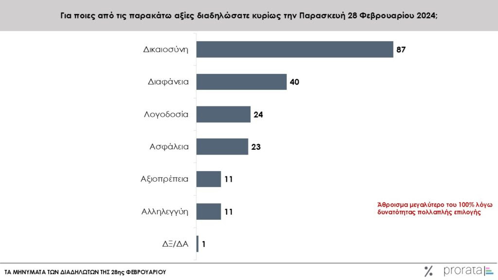 Συγκεκριμένα, όπως απορρέει από την έρευνα της Prorata (μεταξύ 4 και 5 Μαρτίου σε δείγμα 720 ατόμων άνω των 17 ετών που συμμετείχαν στις διαδηλώσεις), το κύριο μήνυμα που επιδίωξαν να στείλουν οι διαδηλωτές την Παρασκευή 28 Φεβρουαρίου είναι να αποδοθεί δικαιοσύνη στην υπόθεση των Τεμπών και να τιμωρηθούν οι ένοχοι (76%), ενώ το 46% δηλώνει πως «είμαστε εδώ και λογοδοτείτε για όσα δεν πηγαίνουν καλά τα τελευταία χρόνια» (46%).