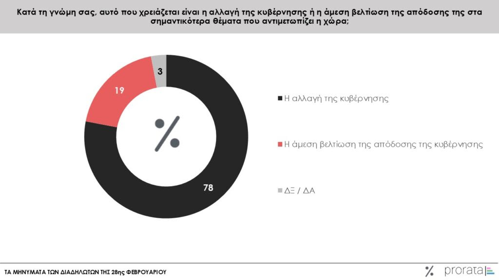 Τέλος, σε σχέση με το τι πιστεύουν οι συμμετέχοντες ότι χρειάζεται η χώρα, το 78% προκρίνει την αλλαγή της κυβέρνησης, με το 19% να προτιμά άμεση βελτίωση της απόδοσης της κυβέρνησης, ενώ μόλις το 3% δεν εξέφρασε άποψη.