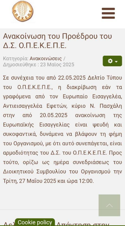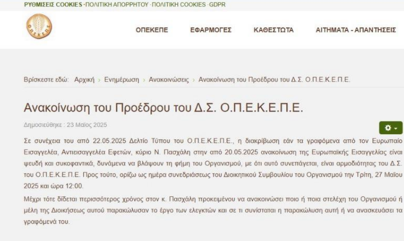 «1. Κατά τον έλεγχο που διενήργησε η Ευρωπαϊκή Εισαγγελία από το πρωί της 19ης.5.2025 έως τις 4.00 το πρωί της 20ης.5.2025 στα γραφεία του ΟΠΕΚΕΠΕ, όλοι οι εμπλεκόμενοι (άμεσα και έμμεσα) με το αντικείμενο της έρευνας υπάλληλοί του, συνεργάστηκαν πλήρως με τους εισαγγελείς και τους αστυνομικούς, καταβάλλοντας υπεράνθρωπες προσπάθειες για να εξάγουν τα ζητούμενα στοιχεία από τις βάσεις δεδομένων πολλών προηγούμενων ετών. Αυτή άλλωστε ήταν και η ρητή εντολή που είχαν από τον Πρόεδρο και το Γενικό Διευθυντή του Οργανισμού.