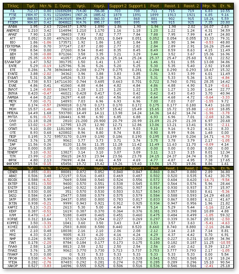 Οι τράπεζες σήμερα σημείωσαν εκ νέου κέρδη έως +9% η Eurobank στο επίκεντρο και με όγκους αυξανόμενους ενώ η Πειραιώς με κέρδη +4%, ξεχωρίζουν. Στον FTSE 25 τα ισχυρά κέρδη της ΔΕΗ από +5% εξανεμίστηκαν και γύρισε σε αρνητικό πρόσημο μετά την πολύ αρνητική έκθεση της Standard and Poor's η οποία προειδοποιεί για την ρευστότητας της. Σήμερα το ελληνικό χρηματιστήριο κινήθηκε ανοδικά με τον Γενικό Δείκτη να κλείνει στις 712,17 μονάδες με άνοδο +0,80% έχοντας υψηλό στις 714,00 μονάδες και χαμηλό στις 706,08 μονάδες.