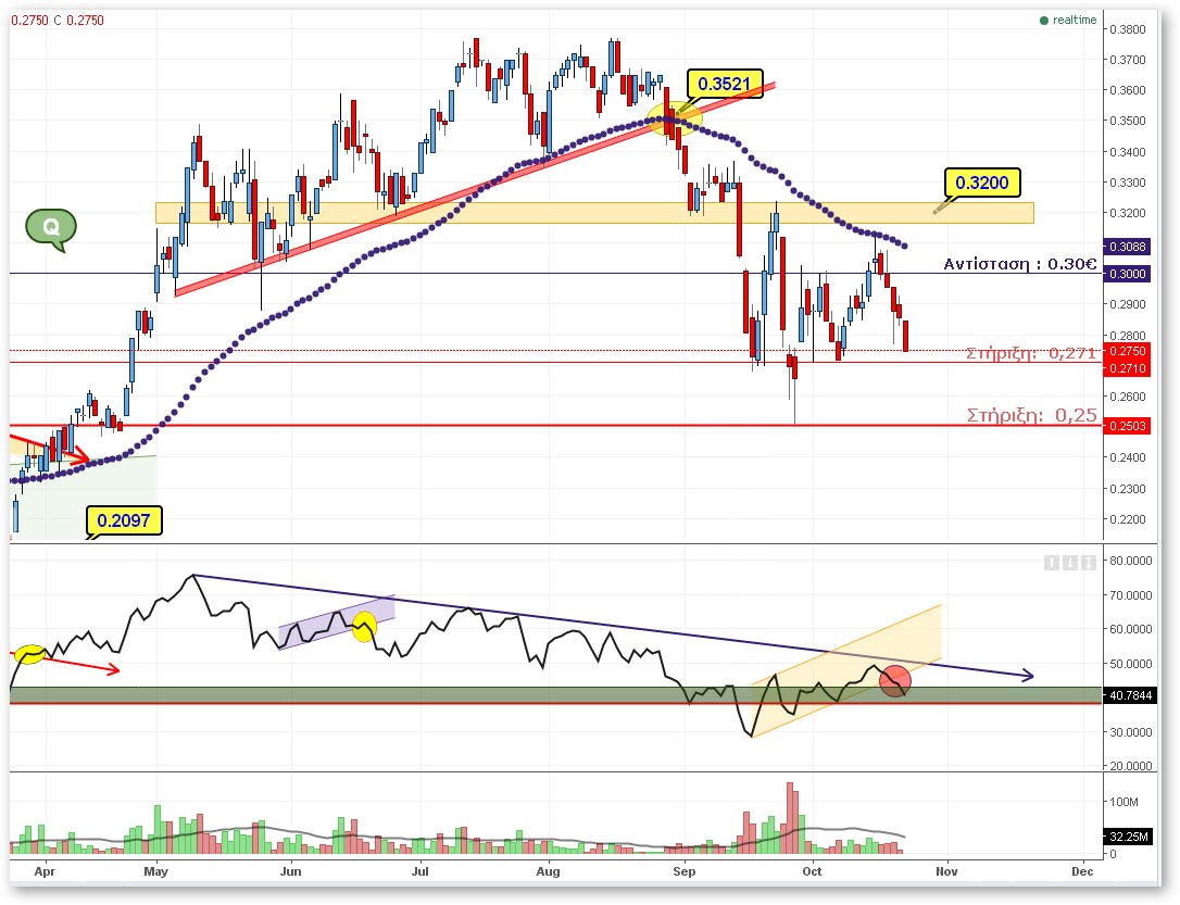 !ΕΤΕ (-1,47%@0,2690): Δεν πρέπει να χαθεί με ισχυρό όγκο συναλλαγών η στήριξη στα 0,2710 ευρώ γιατί θα ανοίξει ο δρόμος για τα 0,2500€.