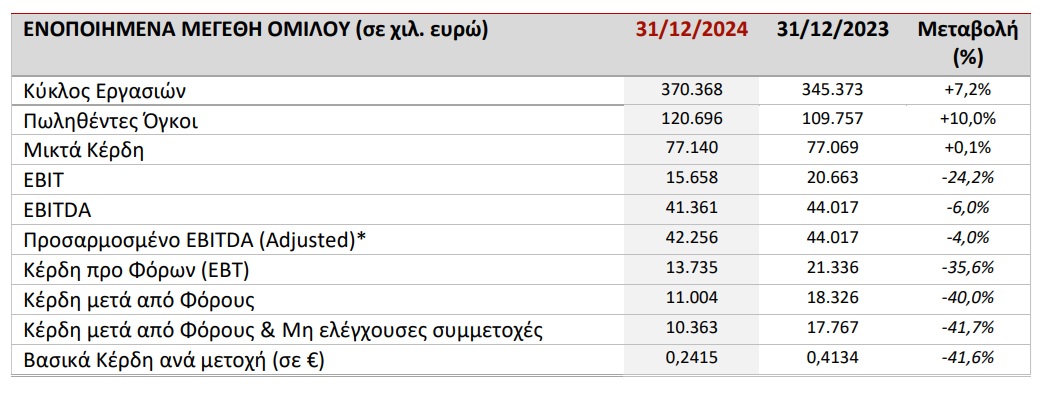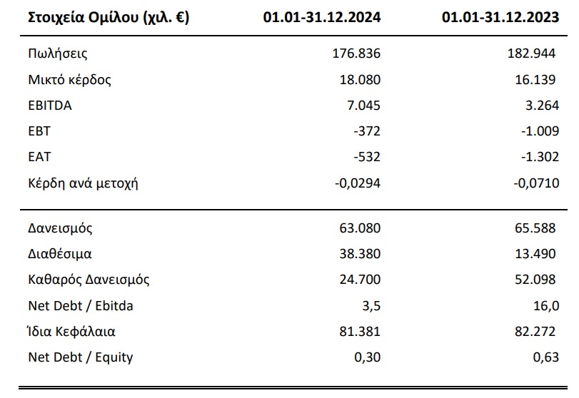 Οι πωλήσεις αυξήθηκαν 13,4% και ανήλθαν στα 14,72 εκατ. ευρώ, ενώ τα επαναλαμβανόμενα EBITDA ανήλθαν στα 2,73 εκατ. ευρώ αυξημένα κατά 29,8%. Τα προ φόρων κέρδη ανήλθαν στα 1,95 εκατ. ευρώ. από 1,1 εκατ. ευρώ περίπου το 2023, ήτοι αύξηση 80,5%. Σε δημοσιευμένο επίπεδο τα μετά από φόρους κέρδη ανήλθαν στα 2,22 εκατ. ευρώ από 2,04 εκατ. ευρώ.
