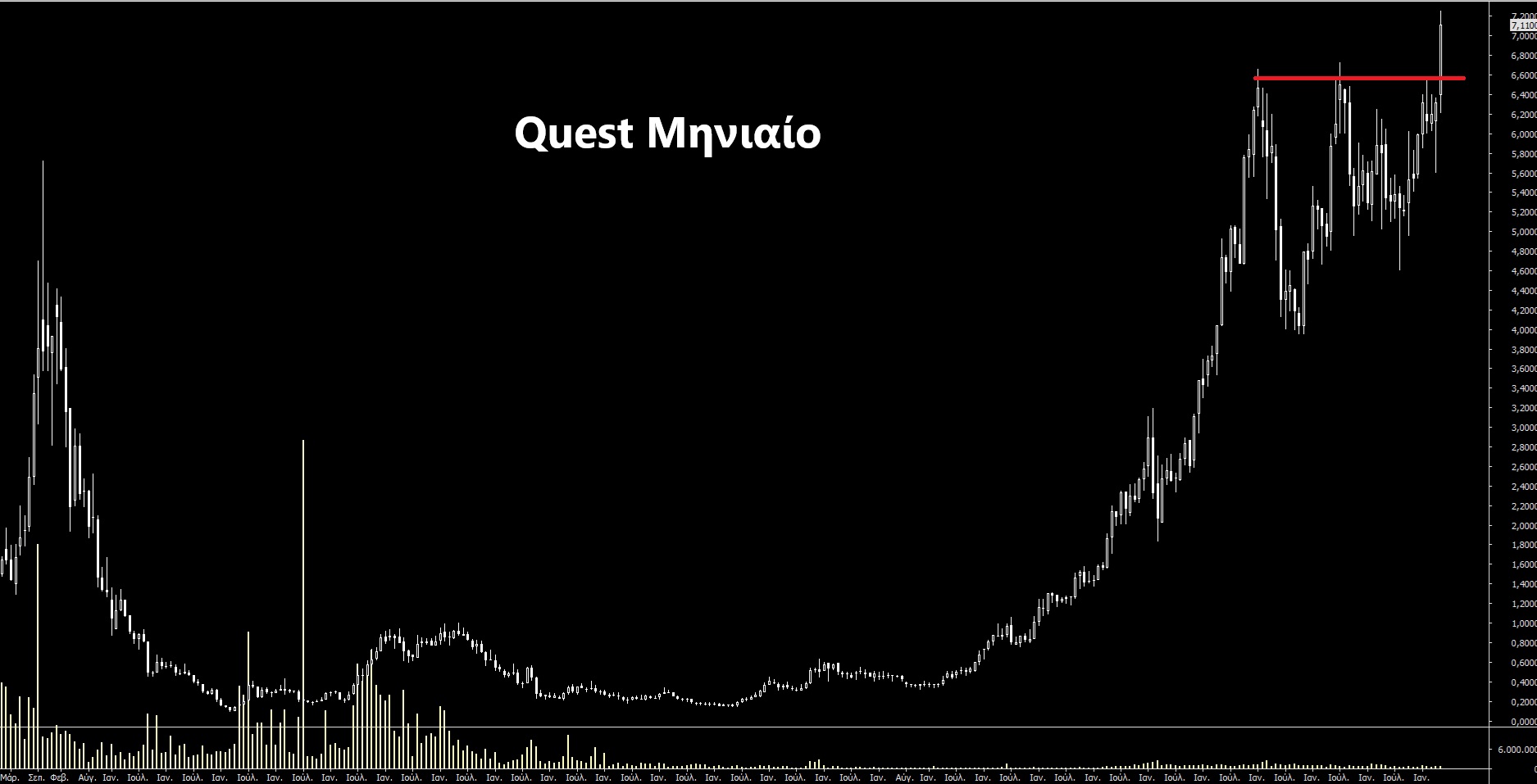 QUEST (απάντηση): Μας ρωτάτε τι είναι αυτή η διάσπαση, στην οποία αναφερόμαστε αφού η μετοχή είναι σε ιστορικά υψηλά. Δείτε το γράφημα και θα καταλάβετε. Στην τρίτη προσπάθεια έσπασε η κορυφή και πλέον ο δρόμος είναι ανοικτός. Με άνοδο 1,97% αλλά με μικρό όγκο στο άνοιγμα.