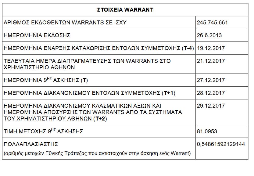Σε συνέχεια των από 26.6.2013 και 04.12.2015 ανακοινώσεων της Εθνικής Τράπεζας Α.Ε. (εφεξής η Τράπεζα) αναφορικά με τους όρους εισαγωγής και τα χαρακτηριστικά των Παραστατικών Τίτλων Δικαιωμάτων Κτήσης Μετοχών (εφεξής τα “Warrants”) που εκδόθηκαν σύμφωνα με τα προβλεπόμενα στο N. 3864/2010 και την Π.Υ.Σ. 38/2012, όπως έχει τροποποιηθεί με την Π.Υ.Σ. 43/2015και ισχύει, σε συνδυασμό με την Π.Υ.Σ 6/2013, η Τράπεζα ανακοινώνει ότι η ημερομηνία 9ης άσκησης είναι η 27.12.2017 (ημέρα Τ).