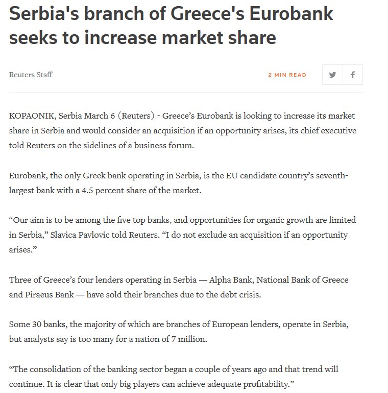 Έτοιμη να εκμεταλλευθεί ευκαιρίες εξαγορών εάν υπάρξουν αλλά και να αυξήσει το μερίδιό της στην αγορά της Σερβίας είναι η Eurobank Serbia, όπως τονίζει η επικεφαλής της Slavica Pavlovic, μιλώντας στο Reuters.