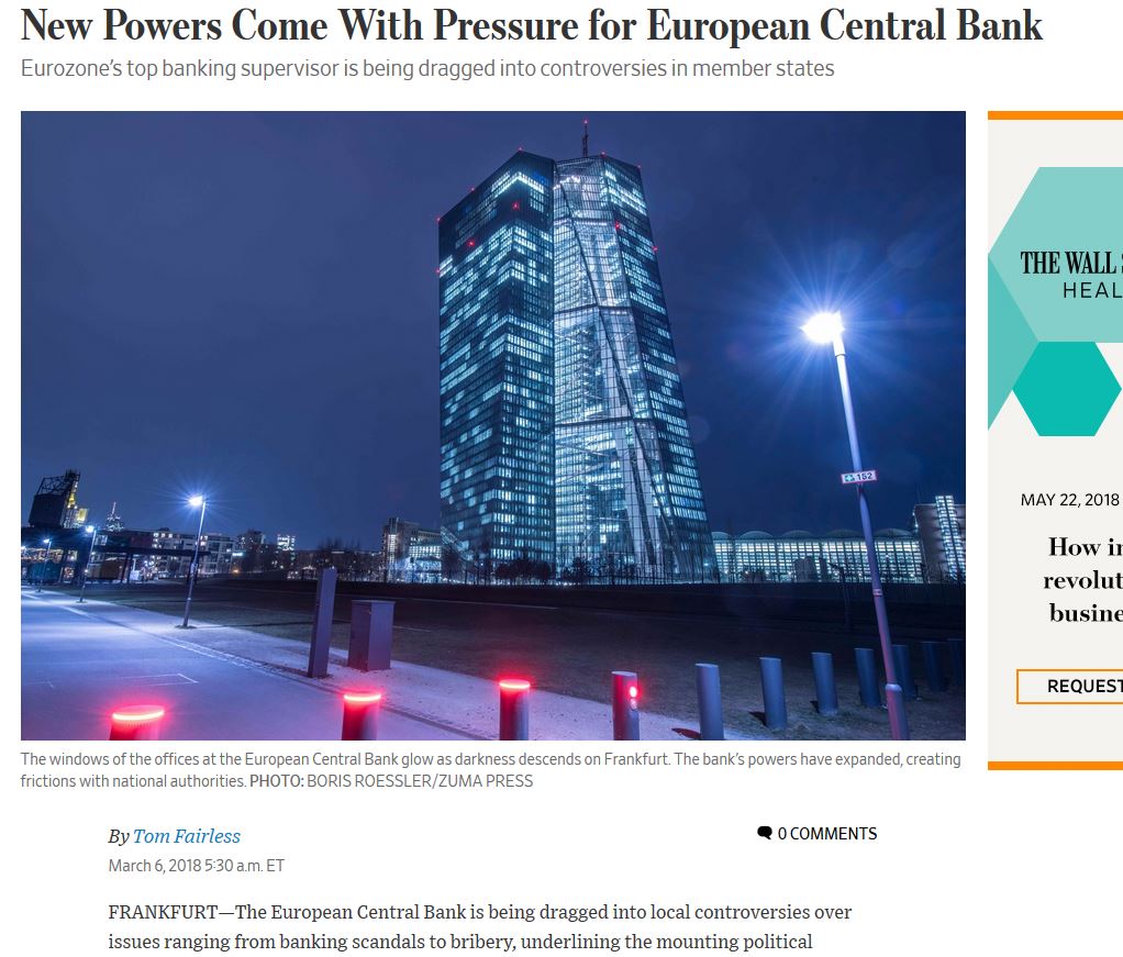 Η Ευρωπαϊκή Κεντρική Τράπεζα σύρεται σε εθνικές διενέξεις για ζητήματα που ποικίλουν από τραπεζικά σκάνδαλα μέχρι δωροδοκίες, γεγονός που υποδηλώνει τις πολιτικές πιέσεις που υφίσταται η δεύτερη ισχυρότερη κεντρική τράπεζα στον κόσμο, την ώρα ακριβώς που αναλαμβάνει έναν εξαιρετικά διευρυμένο ρόλο, γράφει η αμερικανική εφημερίδα Wall Street Journal.