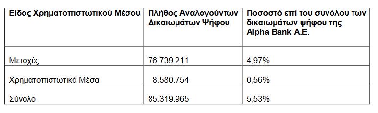Η Alpha Bank ανακοίνωσε ότι η BlackRock, Inc., κατόπιν της από 14.5.2018 σχετικής γνωστοποιήσεώς της, κατέχει έμμεσα από την 10.5.2018 δικαιώματα ψήφου τα οποία αντιστοιχούν σε ισάριθμες κοινές, ονομαστικές, μετά ψήφου, άυλες μετοχές σε ποσοστό άνω του ορίου του 5% επί του συνόλου των δικαιωμάτων ψήφου της Τραπέζης.