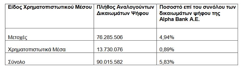 Η Alpha Bank A.E. (η «Τράπεζα») ενημερώνει, κατ’ εφαρμογή του Ν. 3556/2007, ότι η BlackRock Inc., κατόπιν της από 4.6.2018 σχετικής γνωστοποιήσεώς της, κατέχει έμμεσα από την 31.5.2018 δικαιώματα ψήφου τα οποία αντιστοιχούν σε ισάριθμες κοινές, ονομαστικές, μετά ψήφου, άυλες μετοχές σε ποσοστό κάτω του ορίου του 5% επί του συνόλου των δικαιωμάτων ψήφου της Τραπέζης.