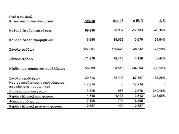 Τα κέρδη προ φόρων και προβλέψεων διαμορφώθηκαν σε 56 εκατ. ευρώ, έναντι κερδών 90,5 εκατ. ευρώ την αντίστοιχη περσινή χρήση στα οποία συμπεριλαμβάνεται το τίμημα από τη συναλλαγή της 2ης τιτλοποίησης ύψους 47 εκατ. ευρώ, αντίστοιχα το τίμημα που περιλαμβάνεται στην συγκριτική χρήση 2017 ανέρχεται σε 70 εκατ. ευρώ.