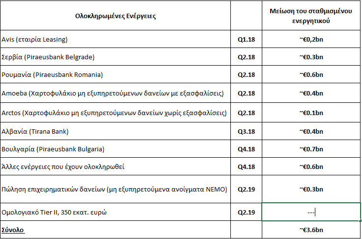 Στα 3,6 δισ. ευρώ θα ανέλθει η μείωση του σταθμισμένου ενεργητικού από τις ενέργειες που έχει ήδη ολοκληρώσει και εκείνες που θα προωθήσει εντός του 2019 η Τράπεζα Πειραιώς.