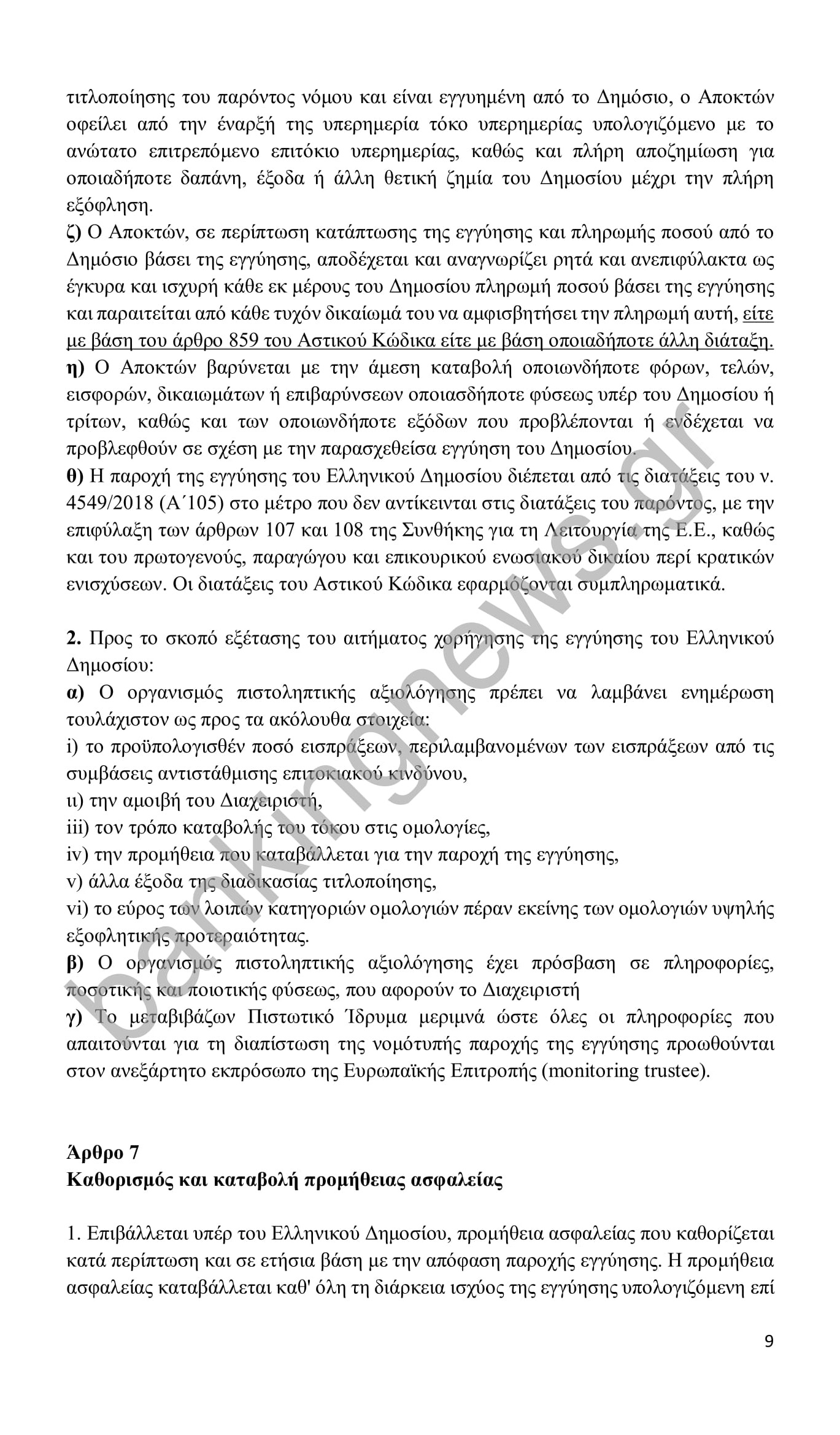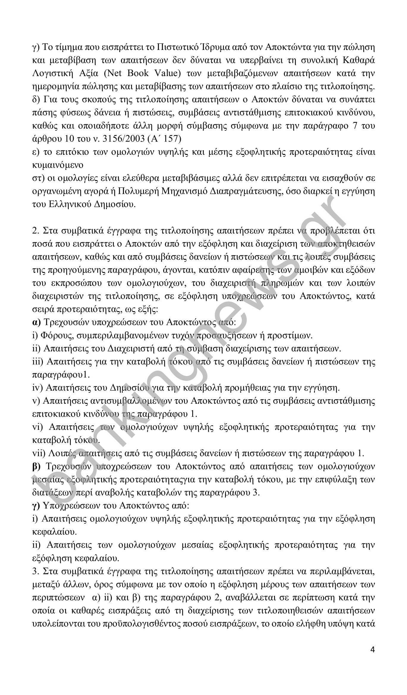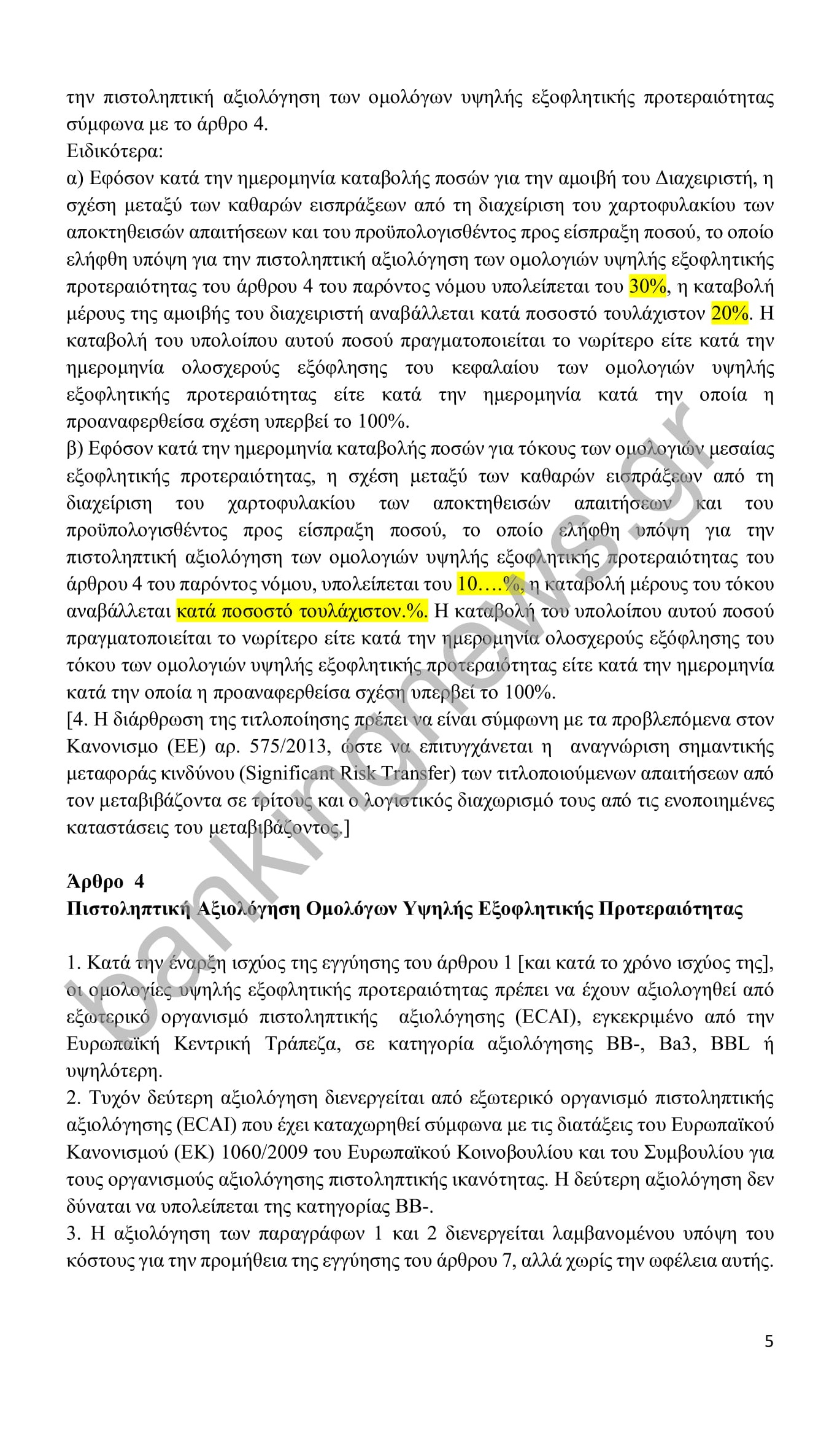 Η εγγύηση ενεργοποιείται μόνο αφού προηγηθεί η μεταβίβαση, έναντι ανταλλάγματος, από το Πιστωτικό Ίδρυμα τουλάχιστον του 50% πλέον ενός των ομολογιών μειωμένης εξασφάλισης και, σε κάθε περίπτωση, αριθμό ομολογιών μειωμένης εξοφλητικής προτεραιότητας, καθώς και, εάν έχουν εκδοθεί, αριθμό ομολογιών ενδιάμεσης εξοφλητικής προτεραιότητας, συνεπεία των οποίων πληρούνται οι προϋποθέσεις μη εμφάνισης των τιτλοποιημένων απαιτήσεων στις οικονομικές καταστάσεις του πιστωτικού ιδρύματος ".