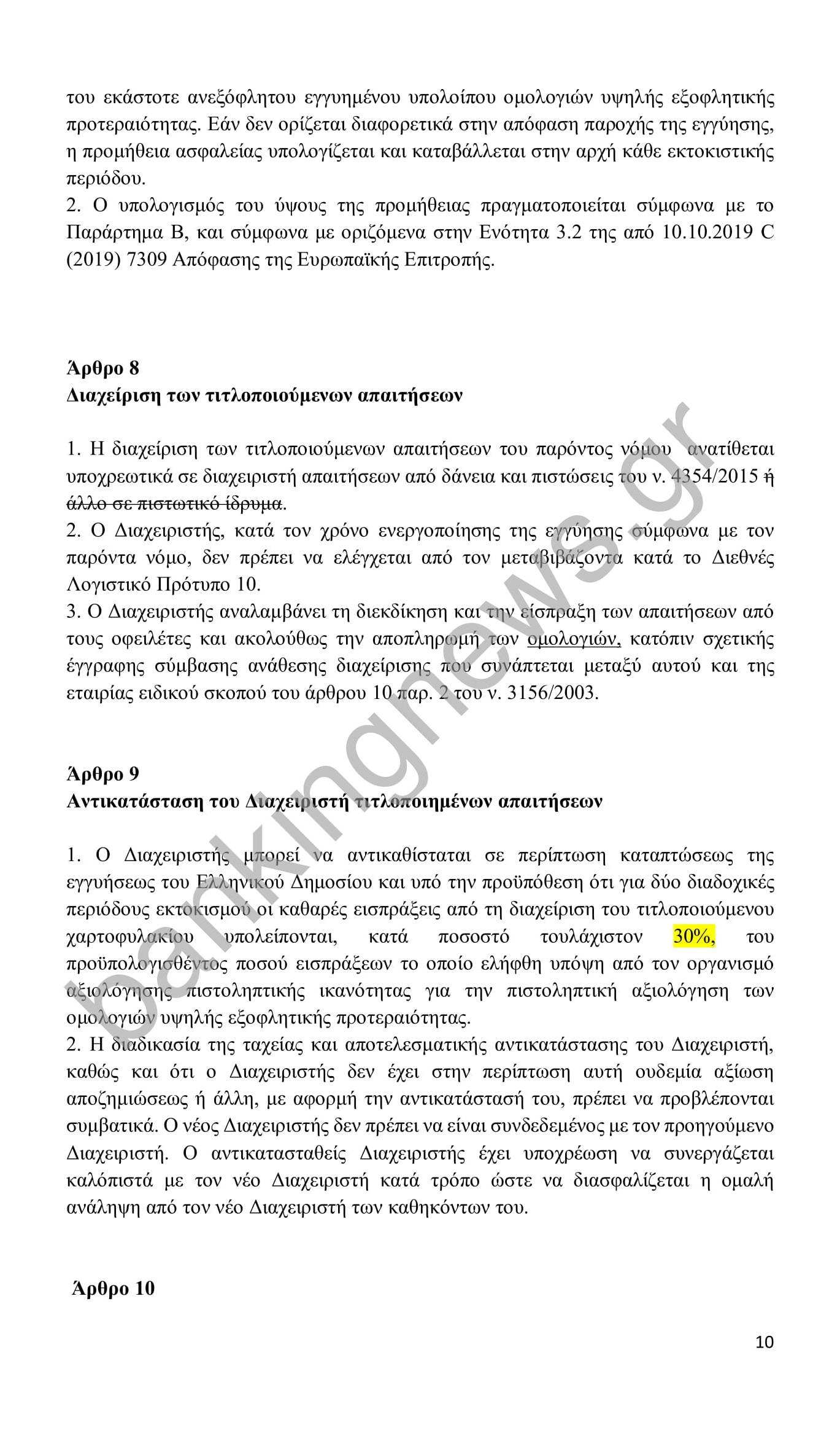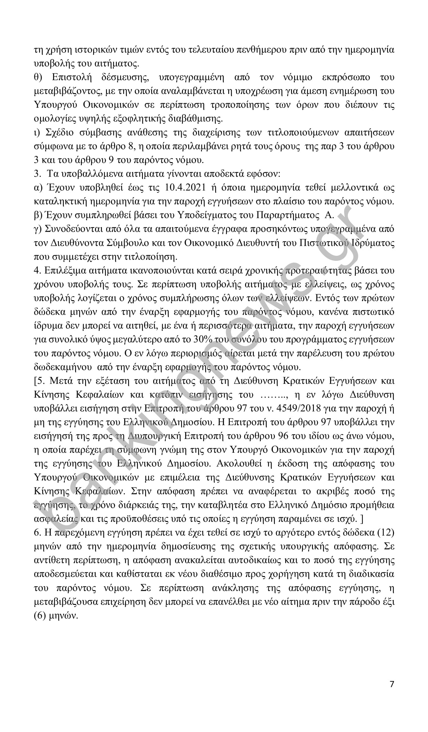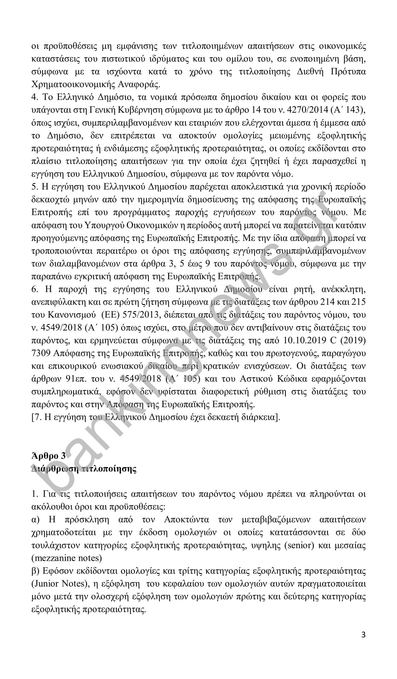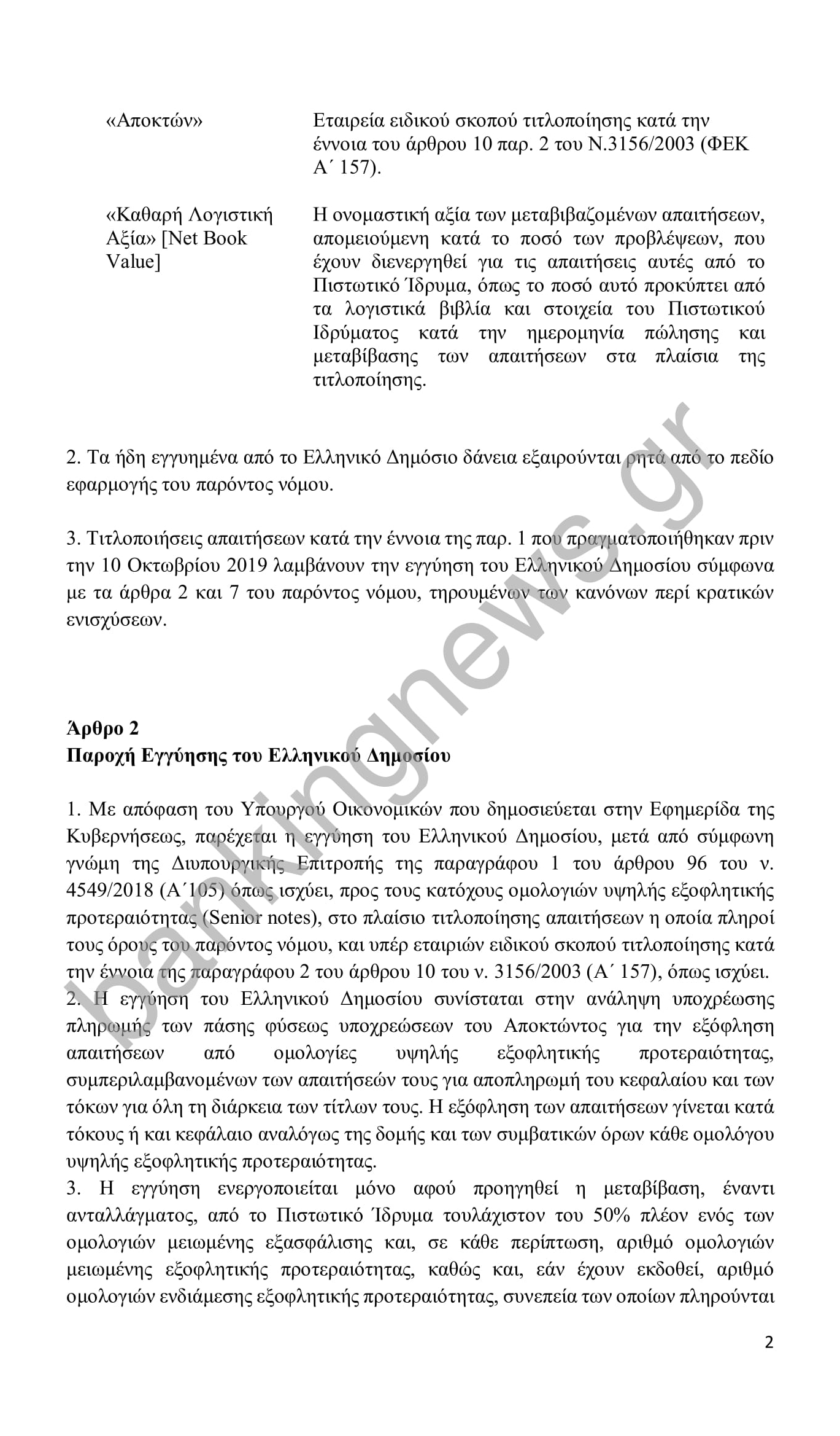 Η εγγύηση ενεργοποιείται μόνο αφού προηγηθεί η μεταβίβαση, έναντι ανταλλάγματος, από το Πιστωτικό Ίδρυμα τουλάχιστον του 50% πλέον ενός των ομολογιών μειωμένης εξασφάλισης και, σε κάθε περίπτωση, αριθμό ομολογιών μειωμένης εξοφλητικής προτεραιότητας, καθώς και, εάν έχουν εκδοθεί, αριθμό ομολογιών ενδιάμεσης εξοφλητικής προτεραιότητας, συνεπεία των οποίων πληρούνται οι προϋποθέσεις μη εμφάνισης των τιτλοποιημένων απαιτήσεων στις οικονομικές καταστάσεις του πιστωτικού ιδρύματος ".