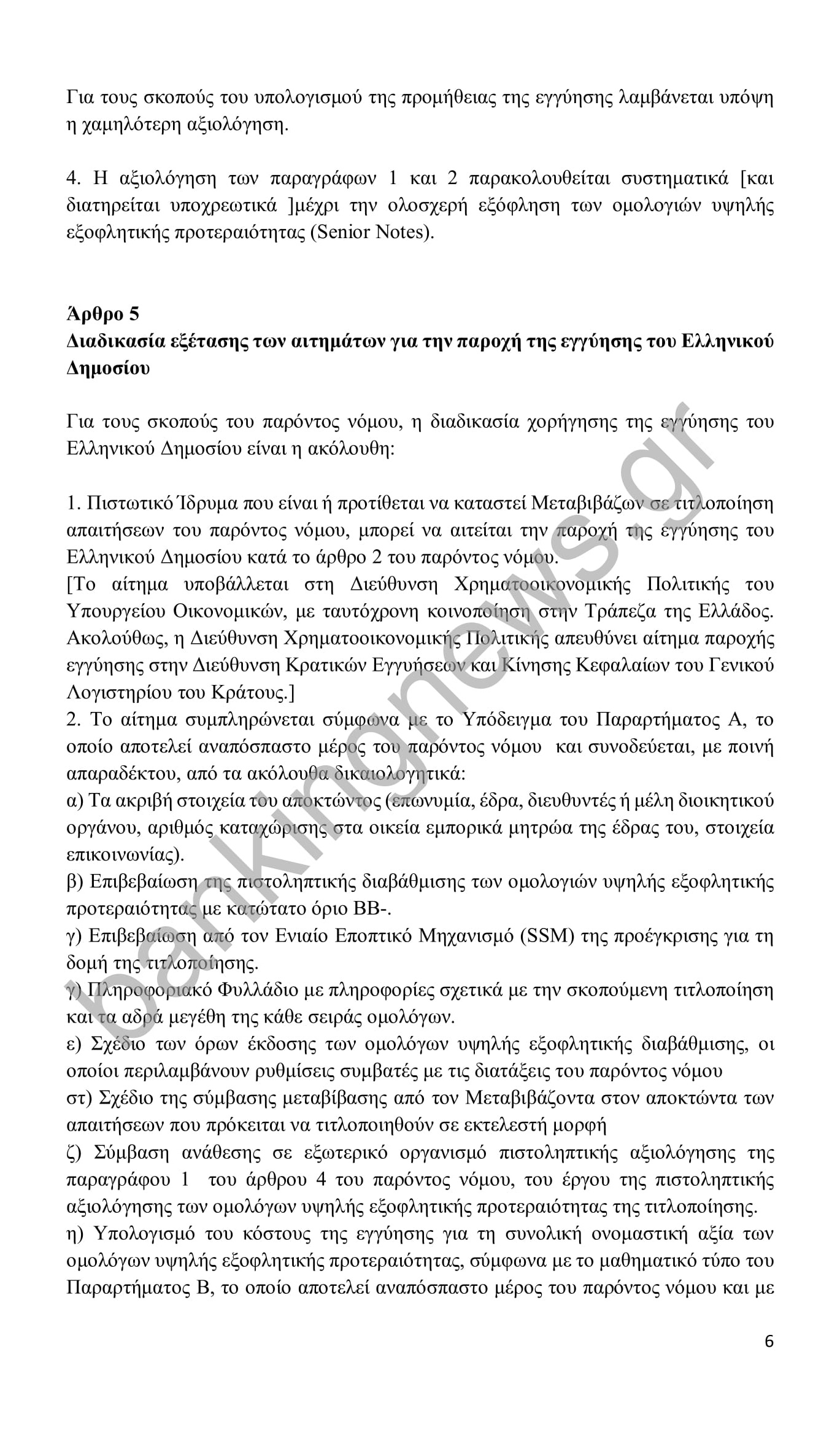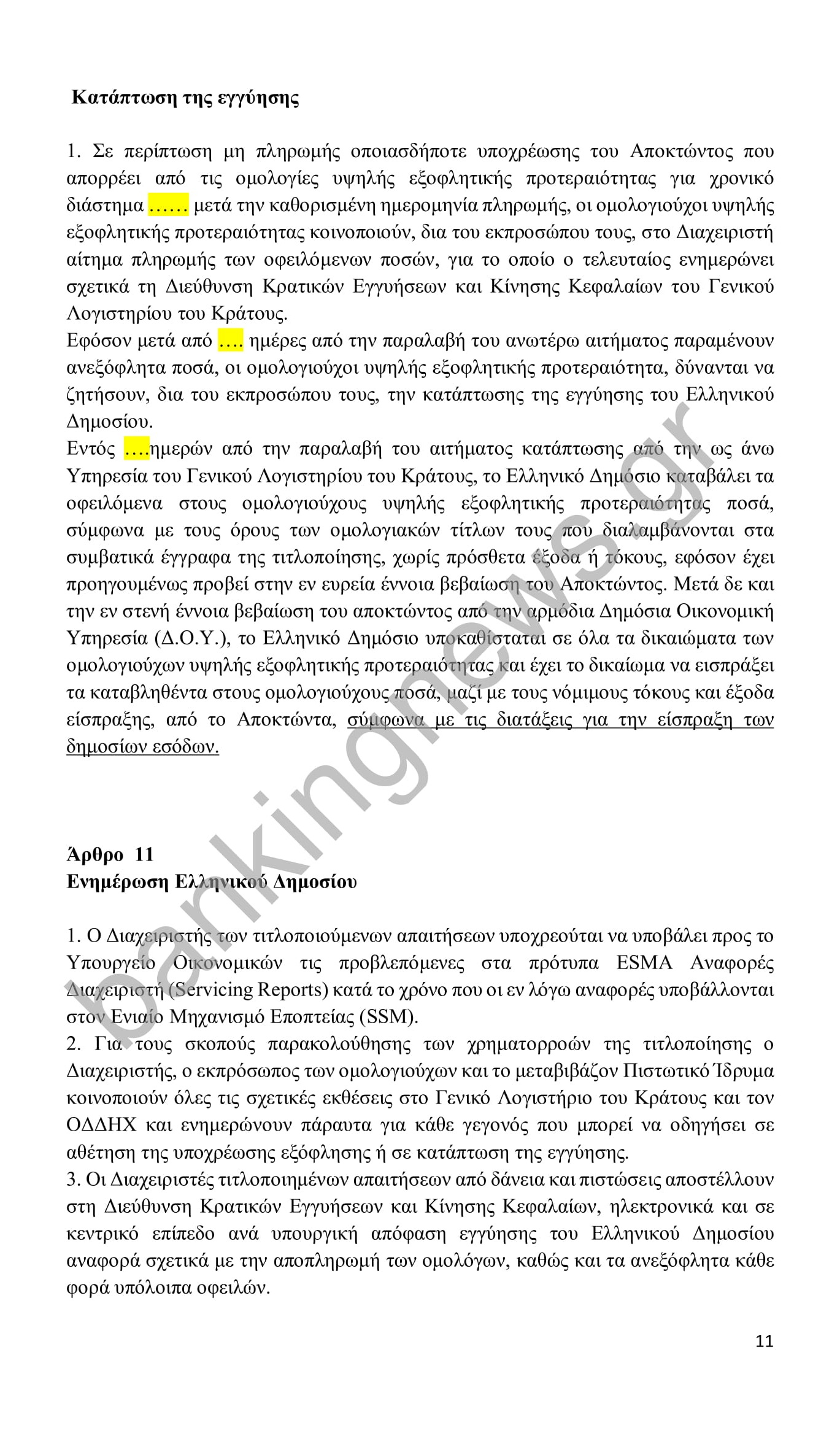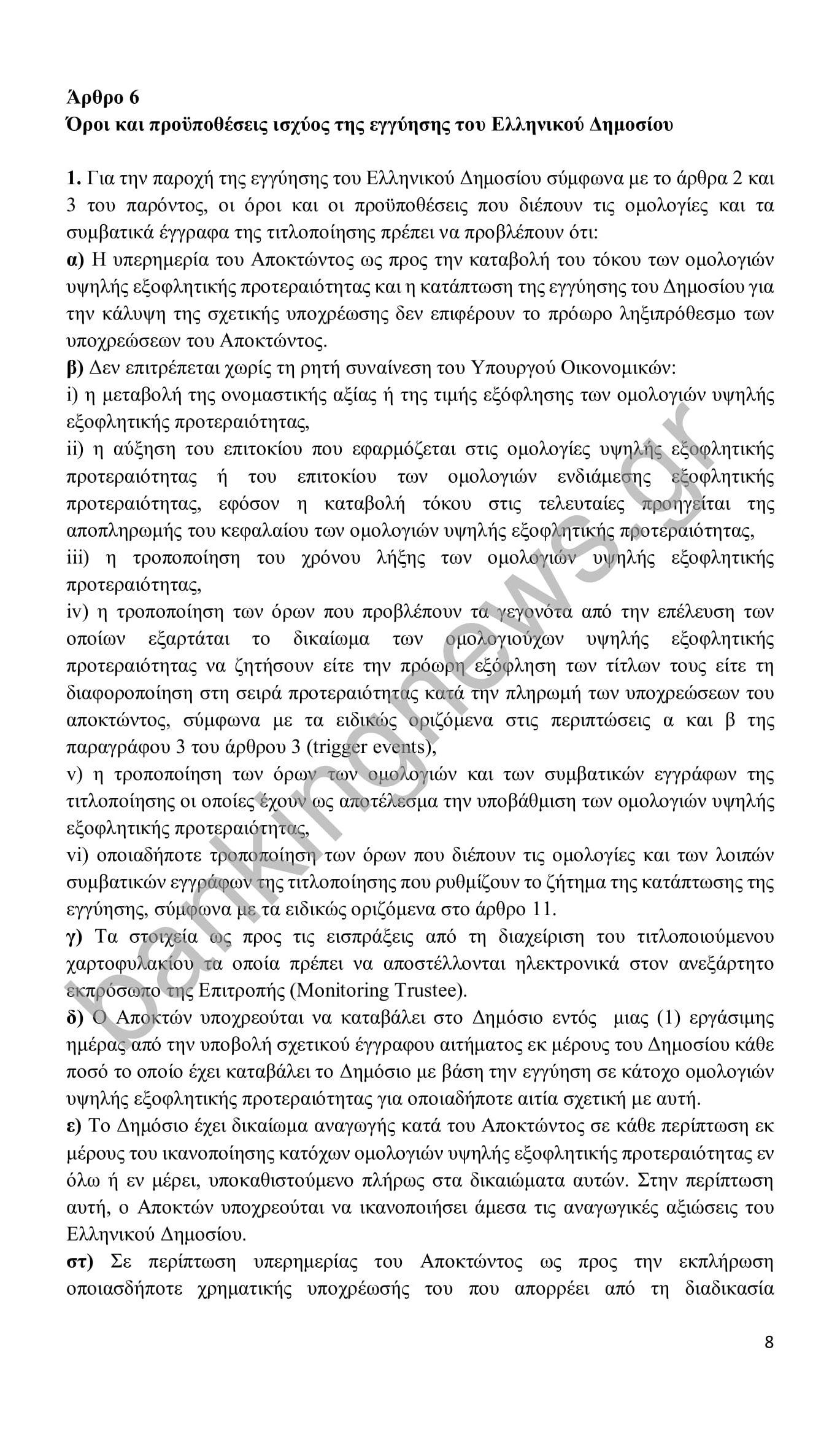 "Η εγγύηση συνίσταται στην ανάληψη υποχρέωσης πληρωμής των πάσης φύσεως υποχρεώσεων του αποκτώντος για την εξόφληση απαιτήσεων από ομολογίες υψηλής εξοφλητικής προτεραιότητας, συμπεριλαμβανομένων των απαιτήσεών τους για αποπληρωμή του κεφαλαίου και των τόκων για όλη τη διάρκεια των τίτλων τους. .
