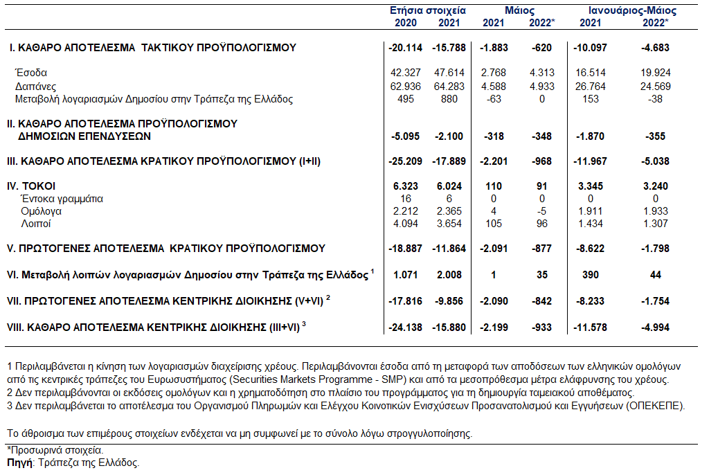 Την περίοδο Ιανουαρίου-Μαΐου 2022, το ταμειακό αποτέλεσμα της κεντρικής διοίκησης της Τράπεζας της Ελλάδος παρουσίασε έλλειμμα 4.994 εκατ. ευρώ, έναντι ελλείμματος 11.578 εκατ. ευρώ την αντίστοιχη περίοδο του 2021.