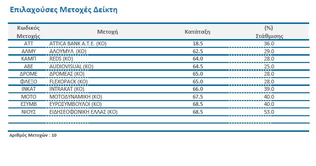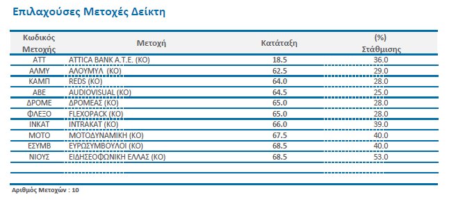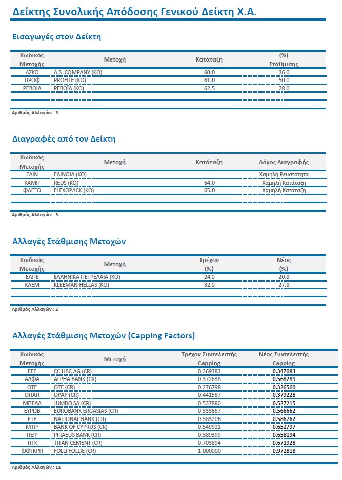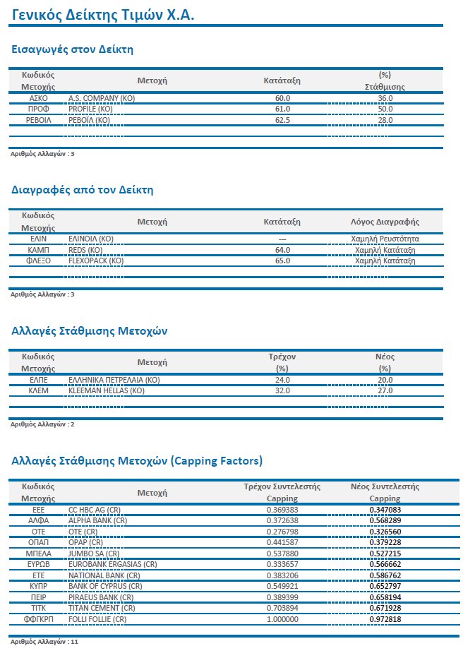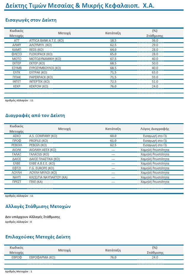 - Στη σύνθεση του δείκτη τιμών μεσαίας και μικρής κεφαλαιοποίησης, εισάγονται οι μετοχές: Attica Bank, Αλουμύλ, ΑΛΜΥ REDS, Flexopack, Μοτοδυναμική, Εκτέρ, Ευρωσύμβουλοι, Ελτράκ, Paperpack, Ιντερτέκ και Κέκροψ. Αντιθέτως διαγράφονται οι μετοχές: A.S Company, Profile, Revoil, Αιολική, Γαλαξίδι, Δάϊος Πλαστικά, ΔΑΙΟΣ ΕΛΒΕ, F.G. Europe, Μύλοι Λούλη, Κλωστήρια Ναυπάκτου και ΓΕΚΕ.