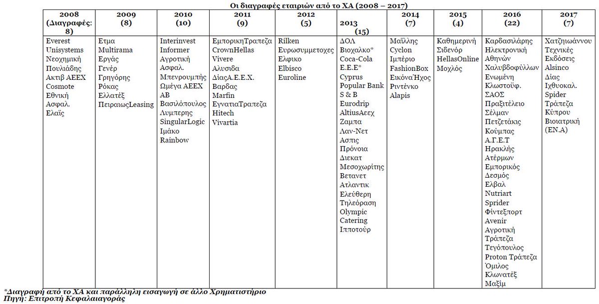 Από το 2008 που σηματοδοτεί την έναρξη της κρίσης οι αποχωρήσεις από το ταμπλό έφθασαν τις 95, σχεδόν το 33% των εισηγμένων εταιριών που διαπραγματεύονταν στο τέλος του 2007.