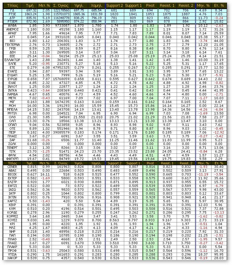 Ο υποτιθέμενος αντιπροσωπευτικός δείκτης του ελληνικού χρηματιστηρίου (πιο αστείος, απλά “πεθαίνεις”) κινήθηκε σ’ ένα εύρος 12,21 μονάδων και σε ποσοστό 1,79% καταγράφοντας τελικά άνοδο 2,05% στις 697,32 μονάδες.
