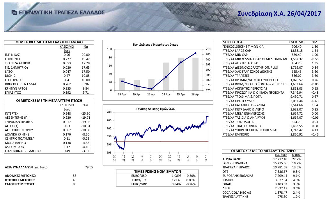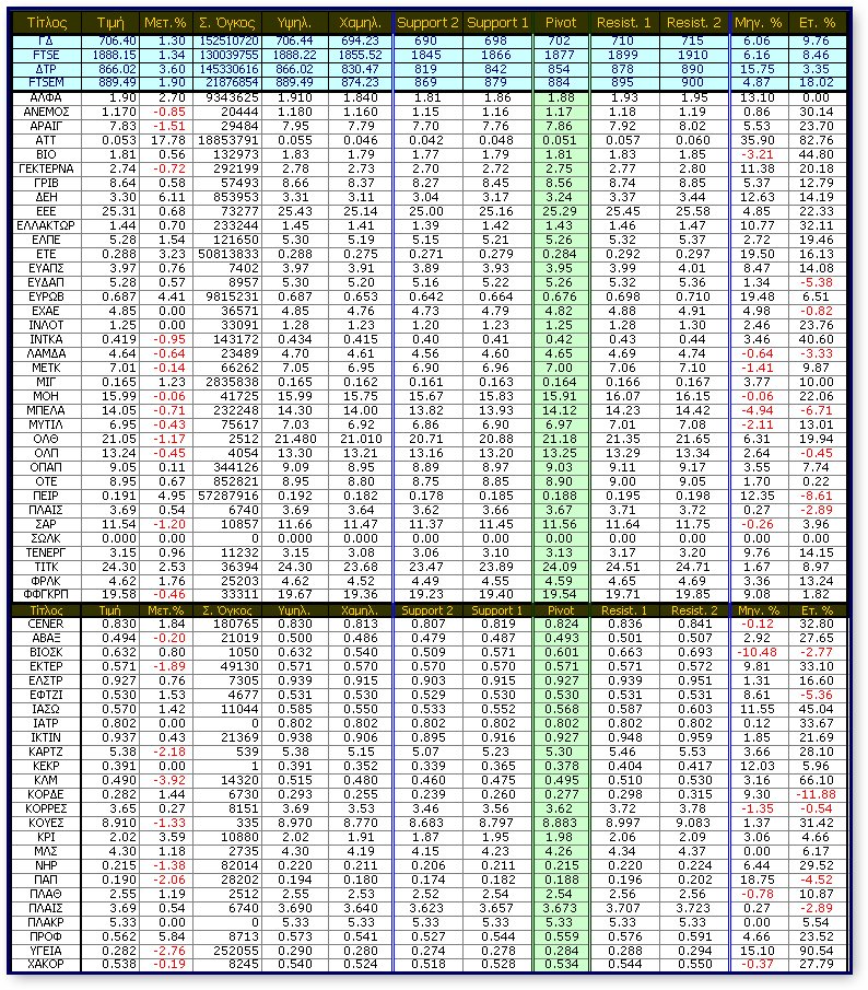 Ο ΓΔ όχι μόνον έφθασε το ψυχολογικό όριο των 700 μονάδων με στηρίξεις κυρίως από τις τράπεζες ειδικά Alpha +3% και Πειραιώς +5% που είχαν μείνει λίγο πίσω στο πρόσφατο ράλι, αλλά και το ξεπέρασε (+1,30% στις 706,4 μονάδες στο υψηλό της ημέρας, μετά το χθεσινό +2,05% και το προχθεσινό +1,75% μία άνοδος 35 μονάδων στο 3ήμερο, περί το 5,3%).