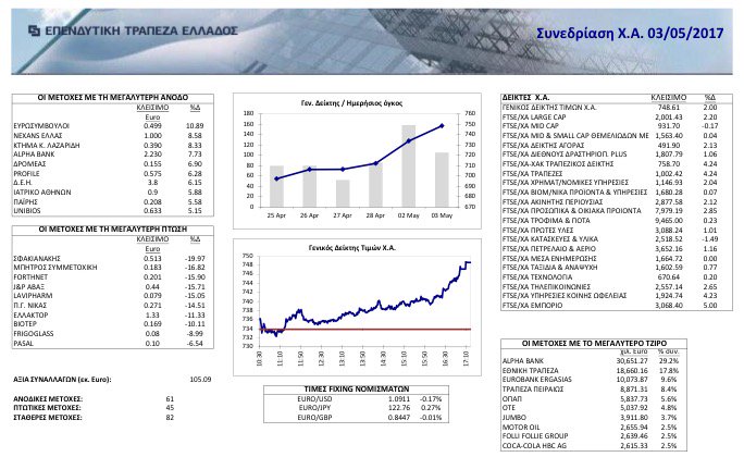 ΑΓΟΡΑ-ΣΧΟΛΙΟ: Με επίκεντρο την Alpha bank +7,73% από τις τράπεζες, την ΔΕΗ +6,15% από τον FTSE 25 και συνολικά τις μη τραπεζικές μετοχές πλην της απαράδεκτης εικόνας του Ελλάκτωρα που υποχώρησε -11,33% λόγω χείριστων αποτελεσμάτων χρήσης 2016 η χρηματιστηριακή αγορά επιχείρησε ανοδικά διασπώντας το εύρος των 735 με 740 και προσεγγίζοντας σε απόσταση ανάσας τις 750 μονάδες.