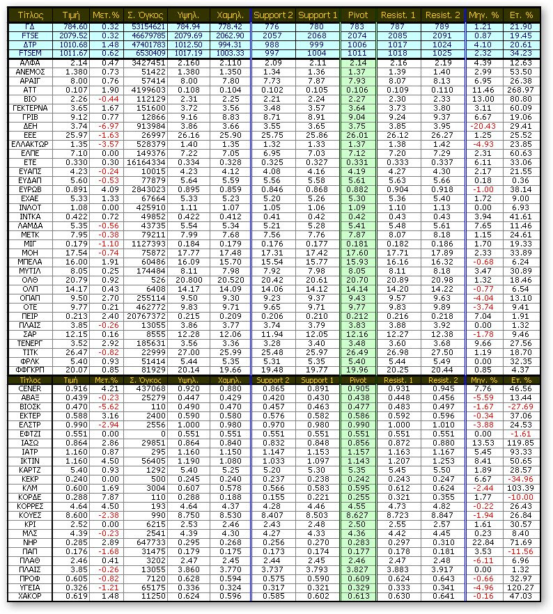 ΤΑΜΠΛΟ – ΜΕΤΑ ΤΙΣ ΔΗΜΟΠΡΑΣΙΕΣ: Στο +1,48% ο ΔΤΡ στις 1010,68 μον., +0,32% στις 784,60 μονάδες ο ΓΔ, στο +0,32% ο FTSE25 στις 2079,52 μ. και ο FTSEM στο +0,62% στις 1011,67 μονάδες. ΑΝΟΔΙΚΕΣ – ΠΤΩΤΙΚΕΣ 61-38 και ΣΤΑΘΕΡΕΣ 22, με τον συνολικό τζίρο της αγοράς στα 46,86 εκατ. ευρώ (Πακέτα: 6,06 εκατ. ευρώ κυρίως σε ΑΛΦΑ, ΟΤΕ και ΦΦΓΚΡΠ)…