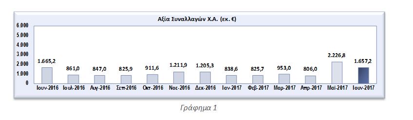 Η Αξία Συναλλαγών του Ιουνίου 2017 έφτασε τα €1.657,20 εκατ. (βλ. γράφημα 1) σημειώνοντας μείωση κατά 25,6% από τη συναλλακτική δραστηριότητα του προηγούμενου μήνα που ήταν €2.226,81 εκατ. Σε σχέση με τον Ιούνιο του 2016 που η αξία συναλλαγών ήταν €1.665,21 εκατ., σημειώθηκε μείωση της τάξης του 0,5%.