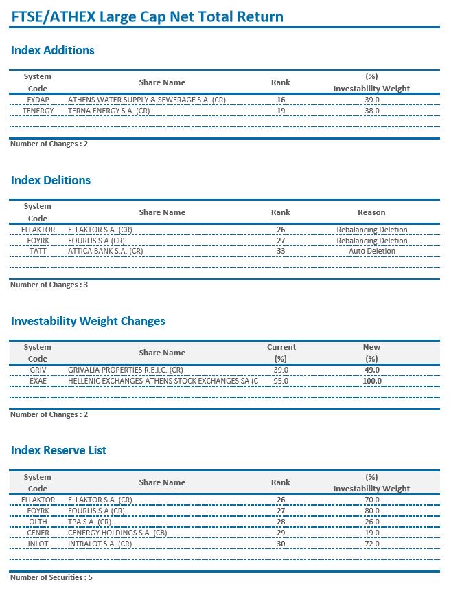 Η Συμβουλευτική Επιτροπή των Δεικτών FTSE/Χ.Α. κατά τη συνεδρίαση της ενέκρινε τις ακόλουθες αλλαγές στη σύνθεση των δεικτών ως αποτέλεσμα της τακτικής εξαμηνιαίας αναθεώρησης της σύνθεσης τους για το διάστημα Μάιος 2017 – Οκτώβριος 2017.