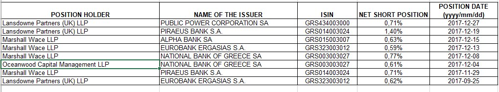 Παράλληλα, οι short θέσεις των Lansdowne, Marshall Wace και Oceanwood στις τράπεζες παραμένουν αμετάβλητες, όπως αυτές διαμορφώθηκαν το πρώτο δεκαπενθήρο του Δεκεμβρίου.
