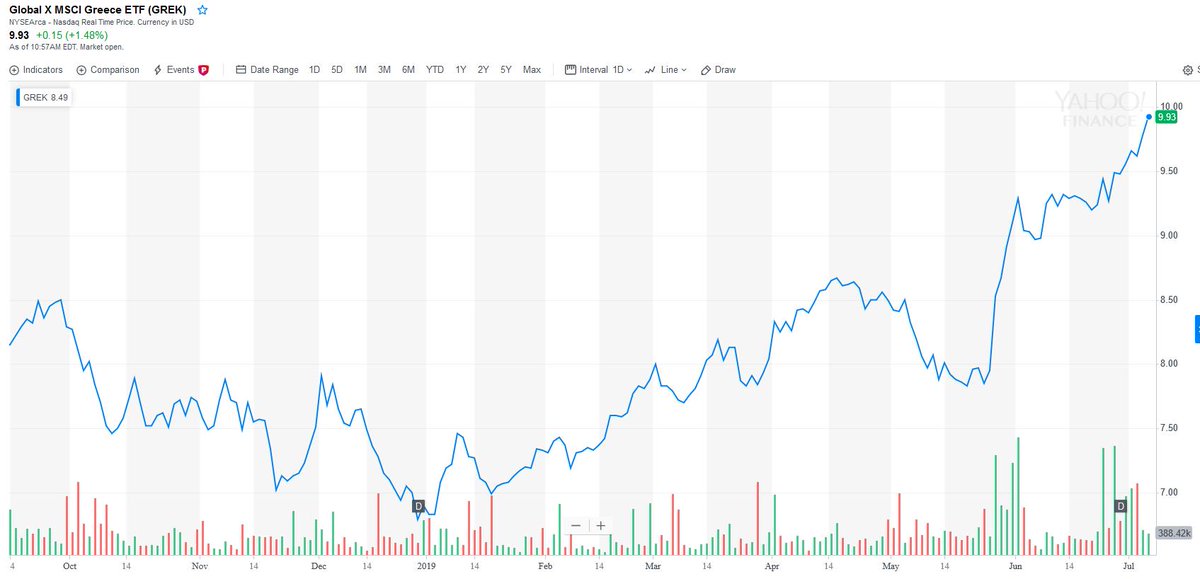 To ETF GREK (GLB X Funds/MSCI Greece ETF) που διαπραγματεύεται στον NYSE και απαρτίζεται από τα πλέον δεικτοβαρείς μετοχές όπως Alpha, ΟΠΑΠ, Εθνική τράπεζα, Eurobank, Πειραιώς, ΕΛΠΕ κ.α. θα μπορούσε να αυξηθεί από τα 9,27 δολάρια (την 1η Μαΐου 2019 ήταν στα 8,5 δολάρια) στα 12 δολάρια υποστηρίζει στέλεχος του Carlyle ενός από τα ισχυρότερα διεθνή fund με 216 δισεκ. δολάρια υπό διαχείριση.