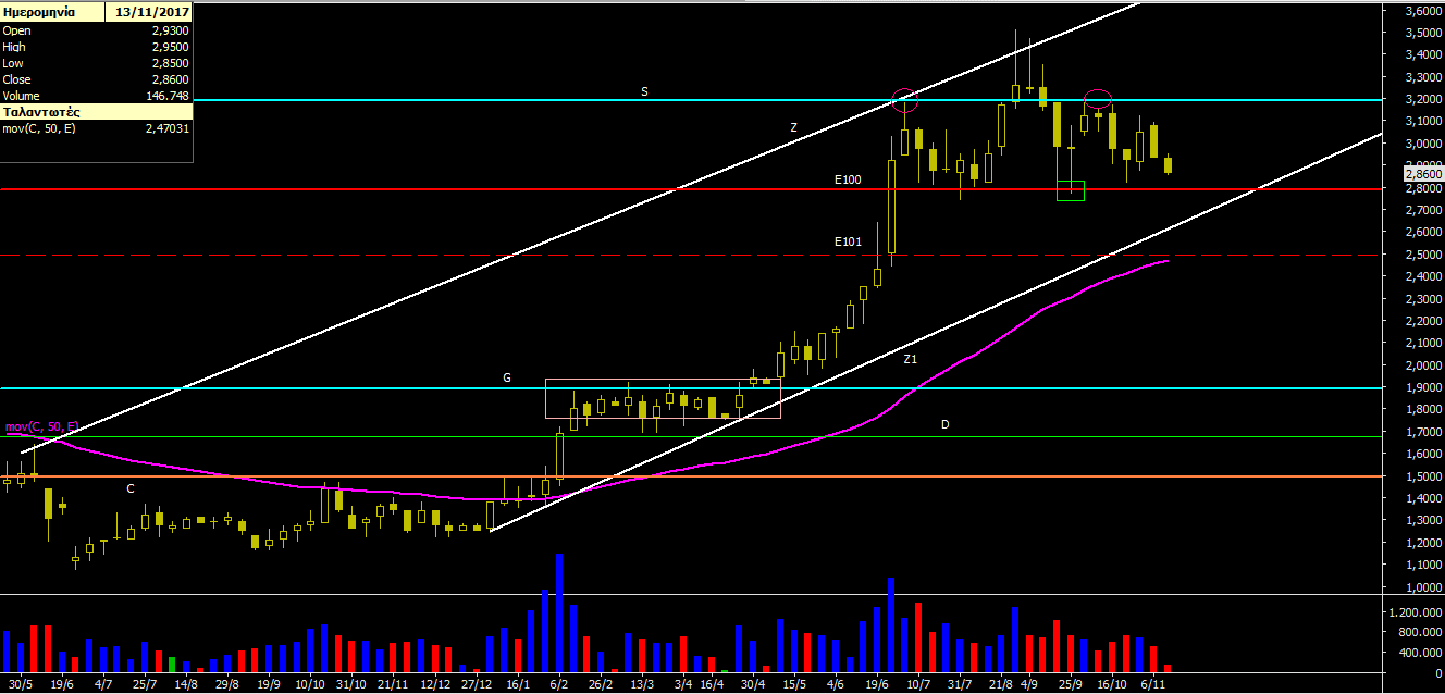Πράγματι ο τίτλος, αρνούμενος να διασπάσει την γραμμή S στα 3,19€ γύρισε προς την Ε100 των 2,80. Ισχυρή στήριξη παρέχει η μεγάλη γραμμή τάσης Ζ1 εάν χαθεί για λίγο η Ε100, ενώ καθοδική διαφυγή από το μεγάλο κανάλι, θα σηματοδοτήσει περαιτέρω πίεση στη μετοχή, με αύξηση του όγκου συναλλαγών και στήριξη ( την ερχόμενη από μακριά ) Ε101 στα 2,50 ευρώ.
